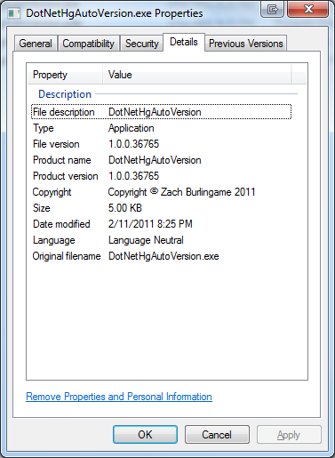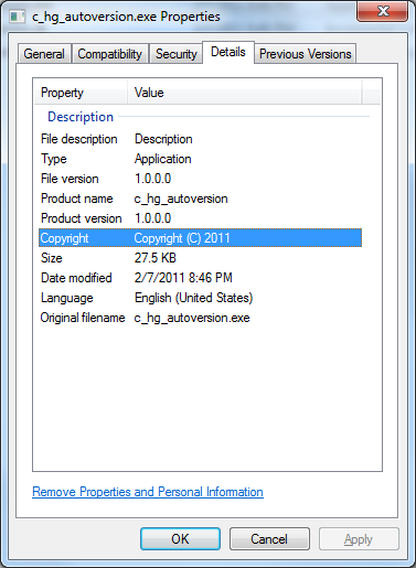 Usually if it’s a product or mature application, there will be a straightforward way to get this information – an About page or the version name right in the application shortcut for instance. When it’s a smaller app or library, or when you need more specific information than “v1.2” though, you might be up a creek. Numerous times I’ve run into this problem on an internal application where there is no installer, about page, or any other information on the version of the binary I’m looking at and what it’s origins might be. Sometimes it’s as simple as “let’s just grab the latest version and try that”, but other times that’s not an option. My solution to this problem on many projects has been to include the version information in the binary or assembly itself. At the very least someone can view the Details tab on the Properties window in Explorer and get the info directly. Best of all it works on all versions of Windows, even if the application won’t run.