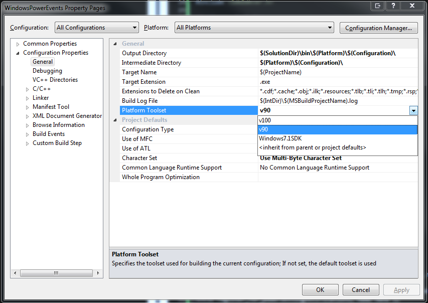 Setting the Platform Toolset in Visual Studio 2010